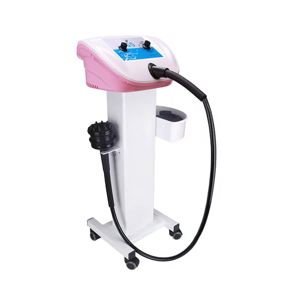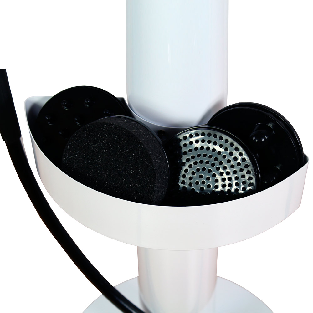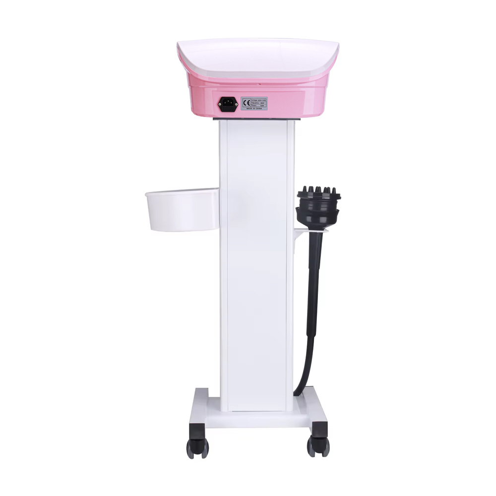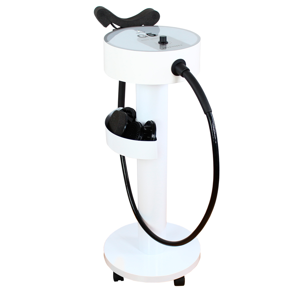 Massaggiatore corpo professionale moderno dotato di sei testine vibranti intercambiabili. Base con ruote per facilitare il movimento dell’unità. Il modello rosa è dotato di timer fino a 30 minuti.