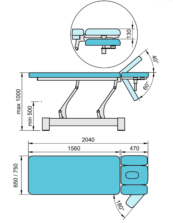 Lettino a due sezioni per visite e trattamenti con regolazione elettrica dell’altezza. Sezione testa con braccioli rotanti regolabili in altezza; standard con apertura facciale.