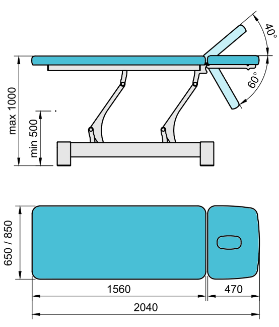La tappezzeria di 8 cm di spessore offre un'ampia e comoda superficie di appoggio. Ogni modello è dotato di un’apertura facciale, per i trattamenti in posizione prona. Il rivestimento in skay di alta qualità è disponibile in un’ampia varietà di colori e texture..