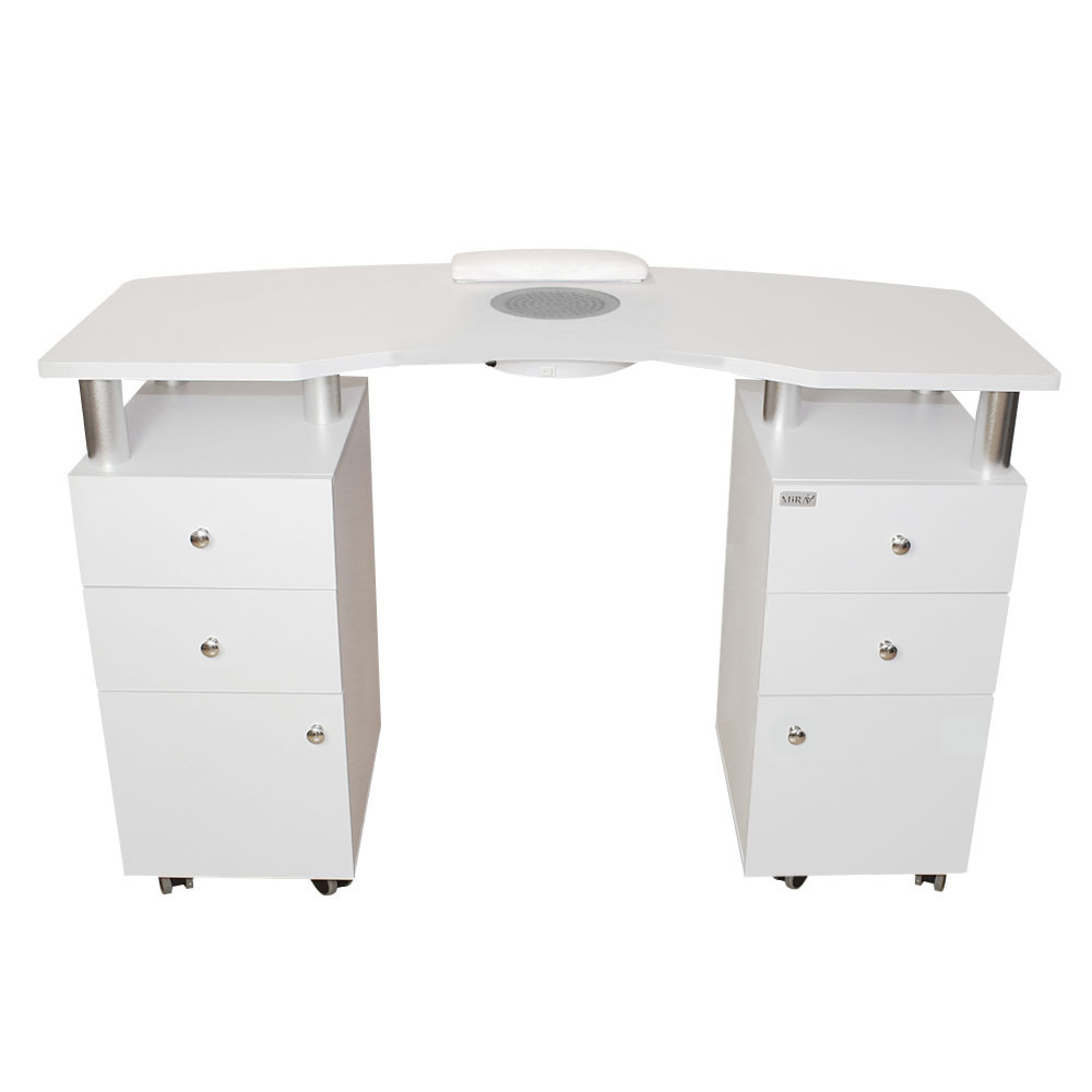Il tavolo da manicure di MIRA mod. DP-53C è in legno, di colore bianco, con due ante a chiusura Servo-Drive (chiusura automatica).