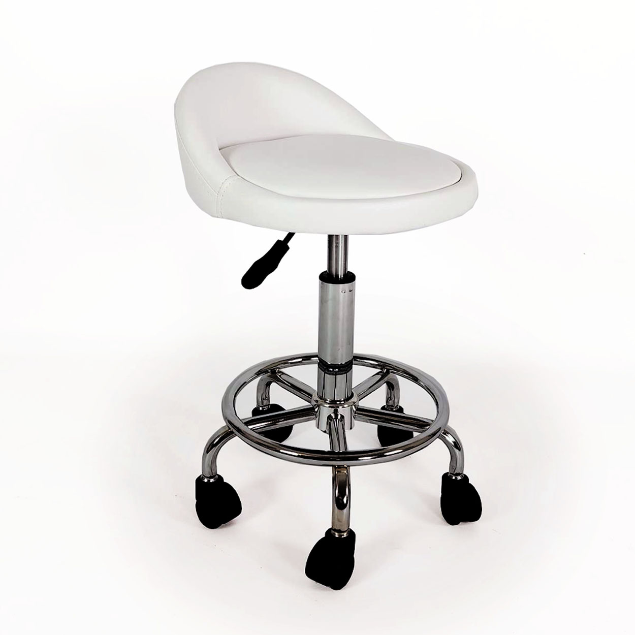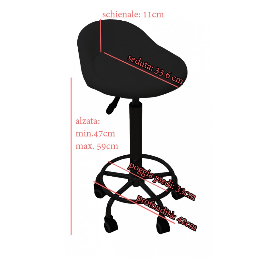 Lo Sgabello B02 è uno sgabello slanciato e comodo, che darà un tocco in più al tuo salone. Ha una struttura solida, con una seduta rotonda di ecopelle bianca, dotata di un piccolo schienale. L’alzata idraulica per la regolazione dell’altezza tramite la leva è posta sotto la seduta; inoltre il sedile ruota completamente a 360 gradi. La base in acciaio cromato, dotata di ben 5 ruote girevoli montate su una struttura con poggia piedi, offre un’ottima stabilità. Il modello B02 è particolarmente indicato per l’estetica, i trattamenti viso & corpo, la manicure o pedicure per gli studi medici o fisioterapici ed infine per i tatuaggi.